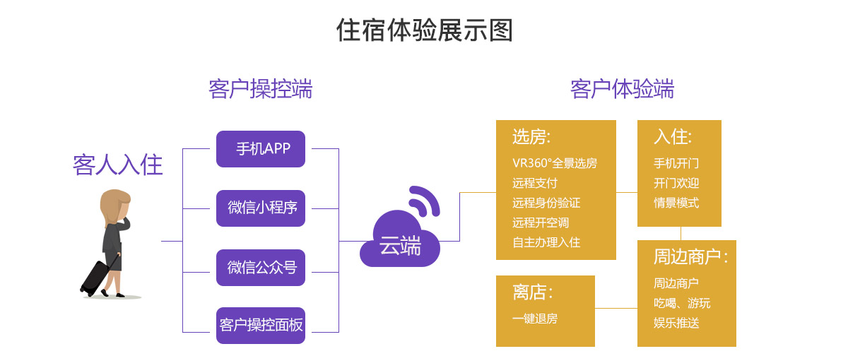 入住后,酒店的各種智能設(shè)施(影音、照明、空調(diào)、安防、家電等系統(tǒng))通過酒店網(wǎng)絡(luò)與用戶手機相連,實現(xiàn)用戶隨心操控。